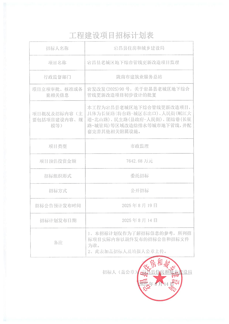 宕昌縣老城區(qū)地下綜合管線更新改造項目監(jiān)理工程招標(biāo)計劃表.pdf