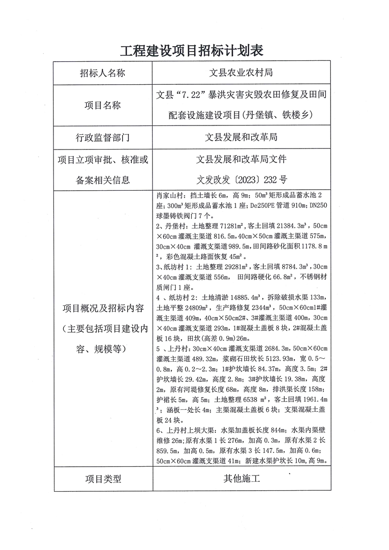 文縣“7.22”暴洪災(zāi)害災(zāi)毀農(nóng)田修復(fù)及田間配套設(shè)施建設(shè)項(xiàng)目(丹堡鎮(zhèn)、鐵樓鄉(xiāng))