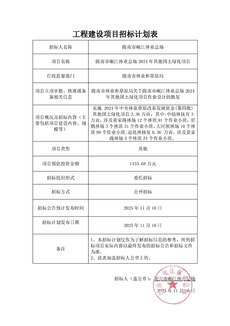 隴南市岷江林業(yè)總場2024年其他國土綠化項目