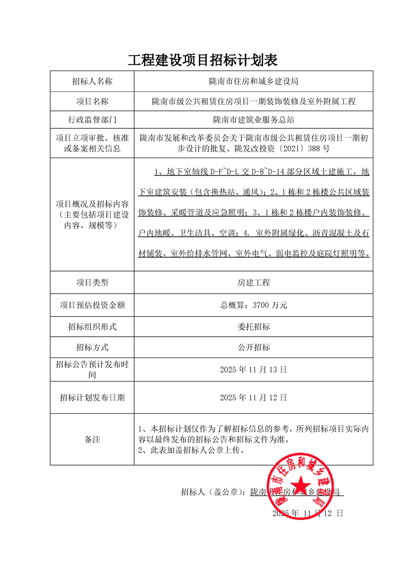隴南市級公共租賃住房項(xiàng)目一期裝飾裝修及室外附屬工程