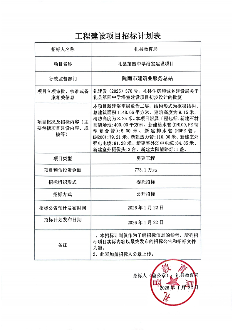 禮縣第四中學(xué)浴室建設(shè)項(xiàng)目