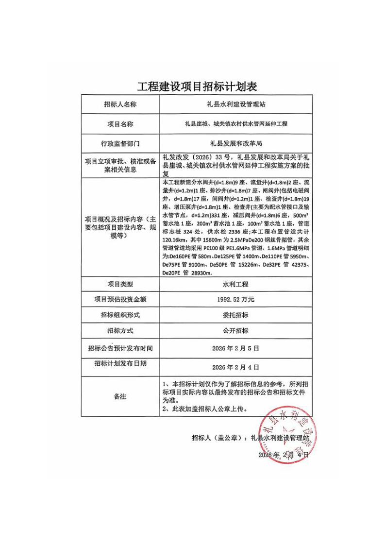 禮縣崖城、城關鎮(zhèn)農村供水管網延伸工程