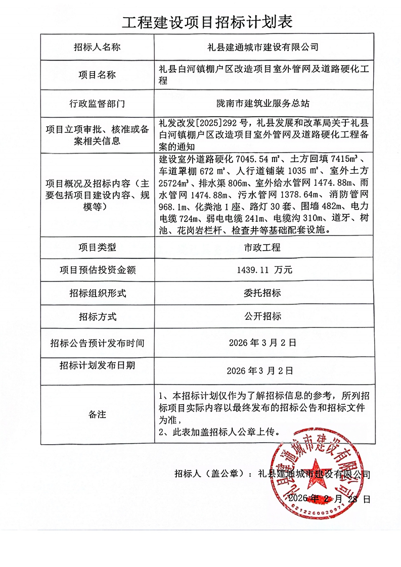 禮縣白河鎮(zhèn)棚戶區(qū)改造項目室外管網(wǎng)及道路硬化工程